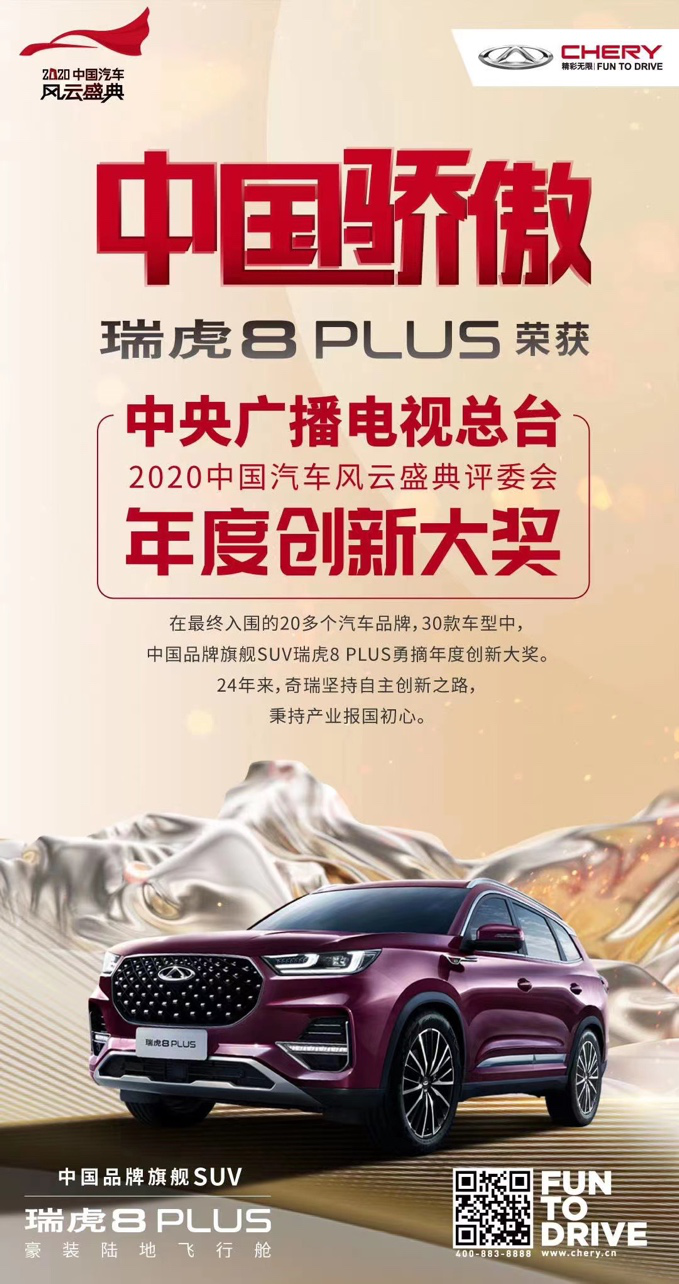 创新奇瑞,让你更精彩。此次瑞虎8 PLUS在“2020中国汽车风云盛典”上荣获“评委会年度创新大奖”,是奇瑞技术创新实力的体现,更是中国制造实力的缩影。24年来,奇瑞立志于打造具有全球竞争力的国际化品牌,在中国汽车产业面临转型升级的关键时期,奇瑞将继续秉承“技术奇瑞”发展战略,掌握关键核心技术,力争在智能化、网联化、电动化、共享化的未来新赛道上,跑出加速度,推动中国汽车产业实现“由大到强”的历史性跨越。