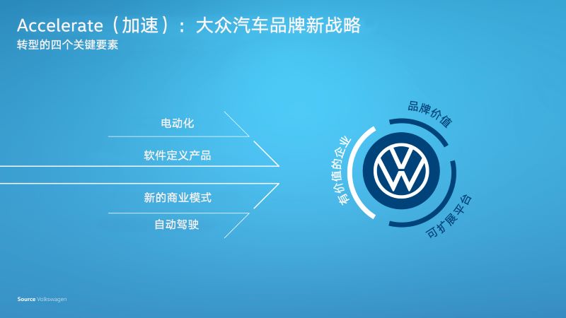 2016年,“变革2025+”战略的发布标志着大众汽车开启了其意义深远的转型,业内规模最大的电动化攻势亦随之启动。现在,通过ACCELERATE(加速)战略,大众汽车致力于转型成为“最具吸引力的可持续出行品牌”。大众汽车将围绕三大战略性价值要素加速转型:“品牌价值”、“可扩展平台”以及“有价值的企业”,而各项具体的措施和宏伟的目标将为这些要素提供支持。