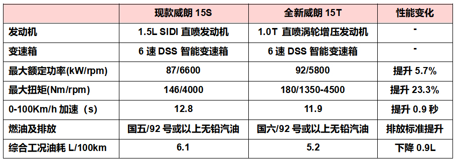 全新威朗15T车型搭载第八代Ecotec 1.0T涡轮增压发动机与6速DSS智能变速箱,最大功率92kW/5800rpm,最大扭矩180Nm/1350-4500rpm,功率扭矩较现款1.5L自吸发动机分别提升5.7%和23.3%;0-100km/h加速11.9秒,比上一代15S快了近1秒。由于涡轮增压发动机的峰值扭矩提早至1350rpm,全新威朗15T车型起步、提速轻快,能够轻松应对城市拥堵路况下频繁起步的低转速工况,而百公里综合工况油耗仅5.2L,比上一代车型下降了14.8%,燃油经济性显著提升。