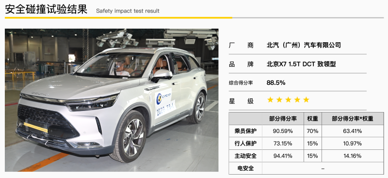 【中国汽车趋势网 3月19日讯】2021年新的一轮C-NCAP成绩公布,BEJING-X7以88.5%的得分获得C-NCAP五星安全评价。