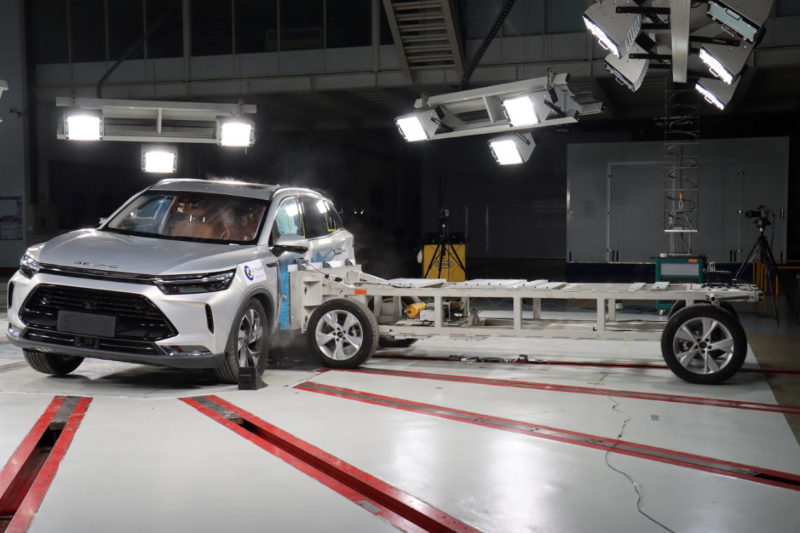 在正面100%重叠刚性壁障碰撞试验中,BEIJING-X7覆盖至轮胎位置的厚实铝合金防撞梁及吸能盒缓冲结构设计,将撞击力直接分化给车身的两根纵梁,通过纵梁的逐级受控折弯通过,有效吸收正面碰撞的能量;在碰撞瞬间,主副驾安全带点爆预紧,达到设定的限力值后安全带力保持恒定,防止乘员胸部损伤。主副驾安全气囊正常弹出,转向管柱按设计方式溃缩,减小驾乘人员头胸部所承受的撞击力,使得车内乘员得到有效的保护。碰撞后,远程救援系统ECALL自动接通,可第一时间通知救援力量赶赴现场。