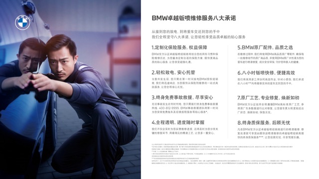 BMW卓越钣喷服务将为客户提供贯穿车辆出险前后各个环节的八项承诺,确保客户真正享受到便捷和值得信赖的高满意度服务:根据客户的用车习惯和保险维修历史,提供量身定制的保险方案;不论事故发生在何时,提供从保险到维修一站式高效服务;不论事故发生在何地,提供终身免费的事故救援服务;车辆维修时,提供维修进度、关键维修工艺的实时反馈;采用多工序协同高效作业,承诺在八小时内将车辆维修完毕;遵循BMW高标准原厂工艺,参照原厂车身数据进行比对修复;使用高品质原厂配件、提供喷漆漆面终身质保等。