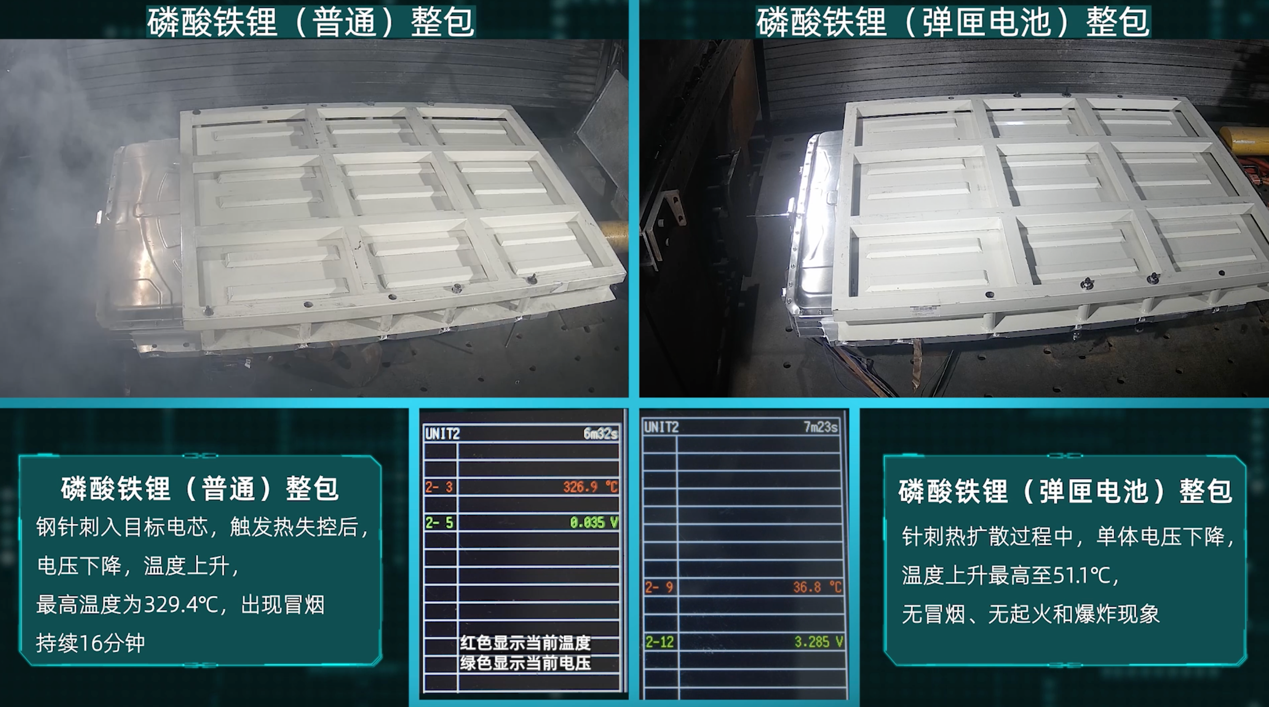 从试验结果来看,搭载弹匣电池系统安全技术的磷酸铁锂整包针刺相对普通整包,不冒烟且温度仅为51.1℃,是目前针刺热失控实验中表现最优的动力电池,刷新了磷酸铁锂电池的安全新高度。