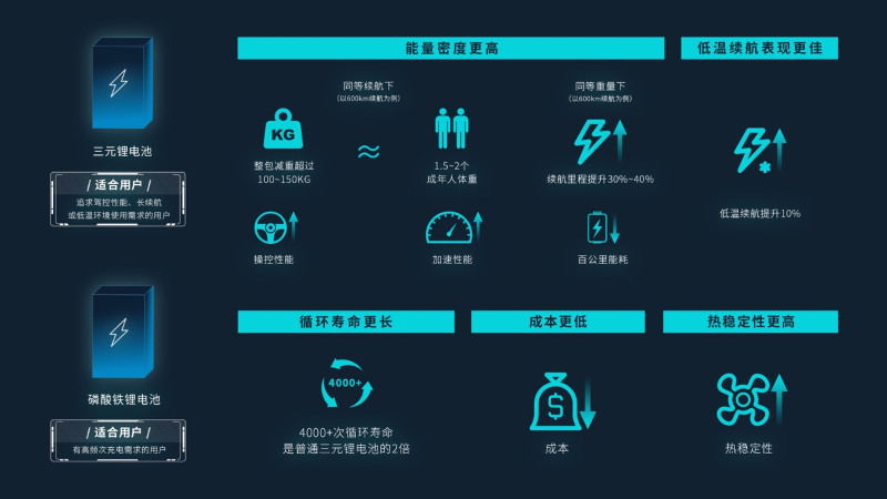 三元锂在同等续航(600km)情况下,电池整包的重量能比其它磷酸铁锂电池减重超过100-150kg,相当于1.5-2个成年人的体重。整车的轻量化,能够让车辆的操控性能和加速性能得到明显提升,适合追求驾控性能和超长续航的客户;其次,三元锂电池在低温环境下的续航能力比磷酸铁锂电池高约10%,在冬季会实现更长的续航表现。而磷酸铁锂则具有4000+次的超高循环寿命,是其他三元锂电池的两倍,同时成本更低,适合有高频次充电需求的客户。因而,磷酸铁锂电池、三元锂电池两种技术路线能满足用户不同的出行需求。