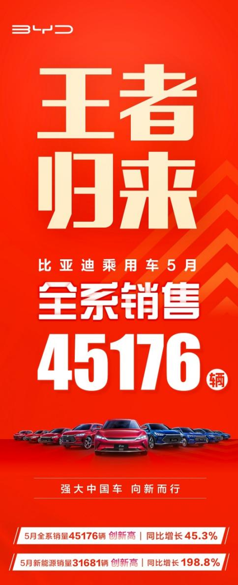 新技术、新产品、新形象、新架构,比亚迪汽车向新而行,一路向前!比亚迪连续8年斩获中国新能源汽车销冠,连续4年全球第一,在很长一段时间内撑起新能源汽车推广的脊梁;在刚过去不久的五月,比亚迪新能源汽车销售31681辆、新能源汽车销量占总销量超过70%,销量同比增长近2倍,上演王者归来!作为中国汽车品牌,比亚迪绝对不会辜负你的关注与支持!