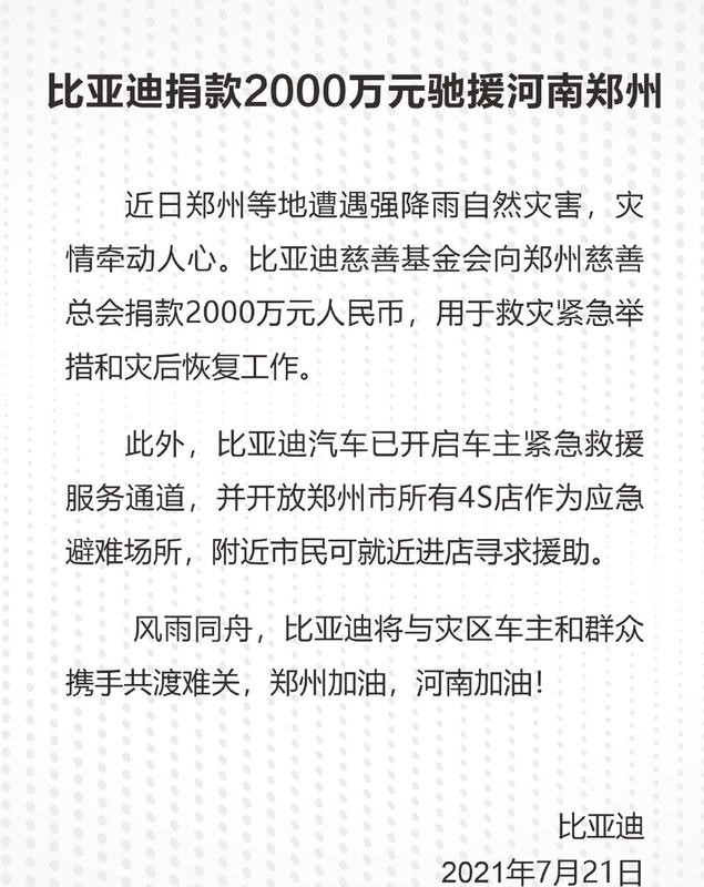 【中国汽车趋势网 7月21日讯】比亚迪捐款2000万元人民币,用于救灾紧急举措和灾后恢复工作。
