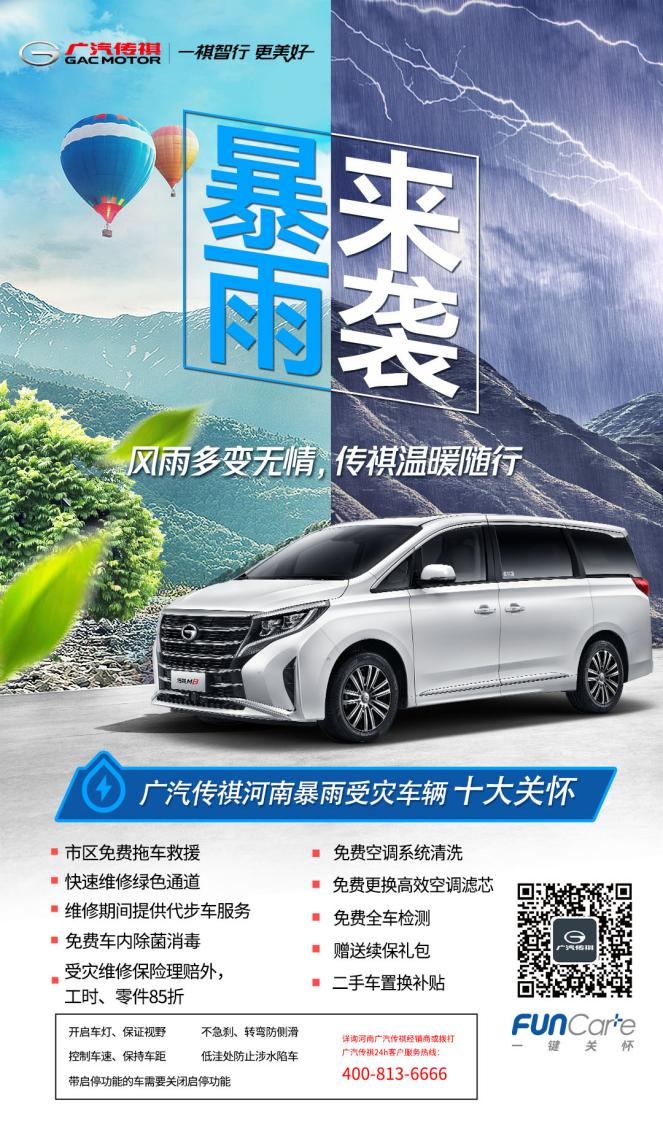 天灾无情,人间有爱。针对河南灾情,广汽传祺已为受灾车辆推出十大关怀服务措施,给予广大车主灾后便捷的用车服务。代步车交付工作也将持续进行,为当地政府及救援机构提供协助,助力河南救援复建工作,重建美好家园。