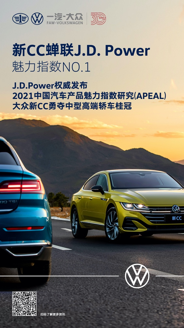 近日,2021年J.D. Power中国汽车产品魅力指数研究(APEAL)结果公布,经消费者评选,一汽-大众CC凭借均衡的综合素质,继2020年之后再次斩获中型高端市场魅力指数第一名,这充分反映出消费者对一汽-大众CC的认可和喜爱。