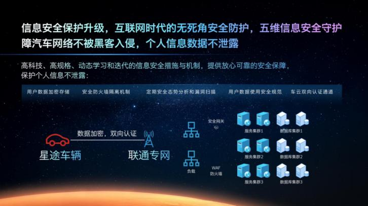 此外,在万物互联的信息时代,信息安全越来越受到消费者的关注,星途致力于保障汽车网络不被黑客入侵,个人信息数据不泄露,M3X火星架构PRO通过用户数据加密存储、安全防火墙隔离机制、车云双向认证通道、用户数据使用安全规范、定期安全态势分析和漏洞扫描五种手段,五维信息安全守护构筑信息安全堡垒,以防、治、管等多通道建立全方位保障,布局汽车信息安全板块。