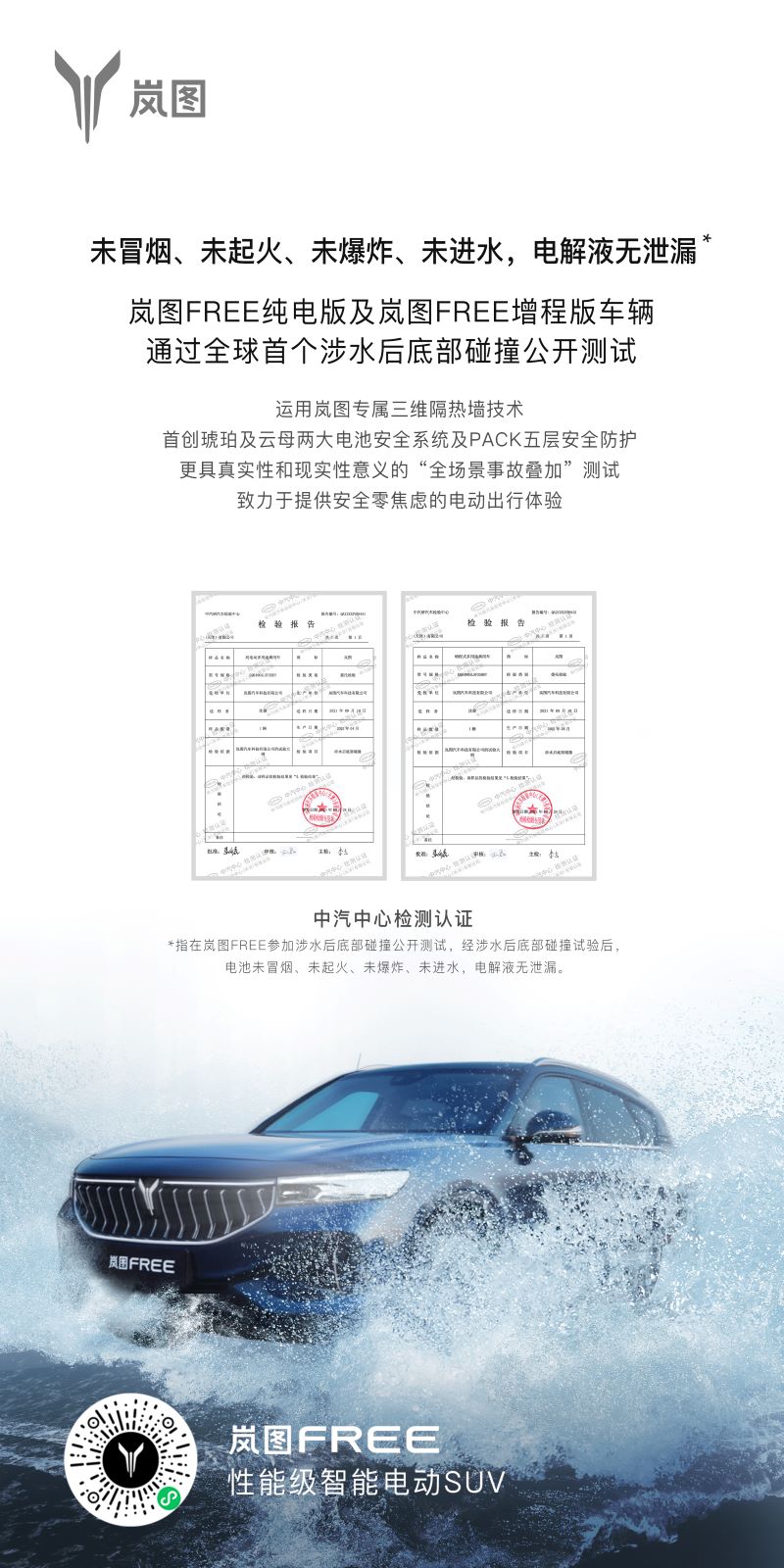 9月26日,由中汽中心权威机构认证,以公安部交管局提供高频事故场景为依据,岚图FREE成功挑战全球首个电动车涉水后底部碰撞公开测试。