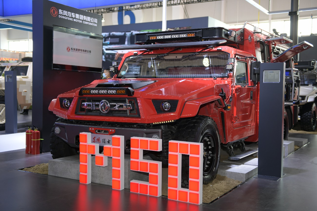 5款军用型车辆英姿飒爽,全方位、立体化展示了东风军车顺应全球新军事变革的创新成果。它们分别是东风猛士反坦克导弹车、东风猛士轮式特战侦察车、东风猛士轻型火箭破障车、东风猛士高机动型卫生防疫车、东风天锦6×6越野运输车。2款民用型车辆包括东风猛士M50综合处突救援保障车和东风猛士M50要地防御车。总成零部件主要有电动轮、分动器、防雷座椅、发动机及飞轮电机等,一展东风军车的技术实力。