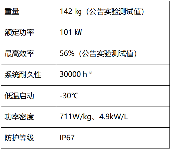 本次开发并开始生产销售的“TL Power 100”基于丰田第2代MIRAI的燃料电池系统,使用了部分国产零部件,配合国内商用车的使用环境,提高了系统的功率以及耐久性,通过在中国本土化的研发,实现了业界顶级的711W/kg、4.9kW/L的高功率密度(额定功率101kW)和长达3万小时※的超长耐久性。