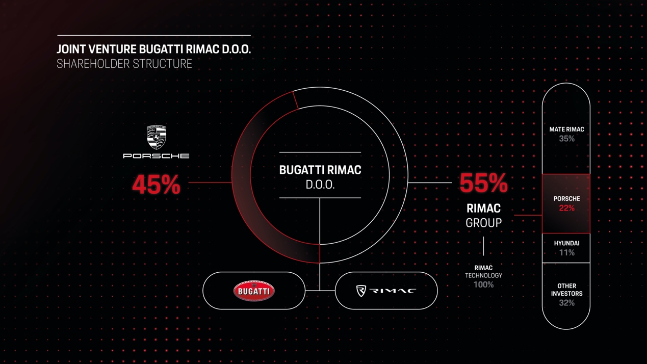 【中国汽车趋势网 11月2日讯】保时捷、布加迪与Rimac正在谱写汽车工业历史的新篇章。在首次宣布后不到四个月,汽车界最激动人心的合作项目之一就已正式启动。Bugatti Rimac合资公司总部将在克罗地亚的斯维塔内得利亚(Sveta Nedelja)设立。公司首席执行官由电动超跑先锋、Rimac汽车创始人兼首席执行官Mate Rimac 出任,而保时捷将作为战略合作伙伴在合资企业中发挥重要作用。保时捷全球执行董事会主席奥博穆(Oliver Blume)和保时捷全球执行董事会副主席兼成员、负责财务与信息技术的麦思格(Lutz Meschke)都将成为其监事会成员。Rimac 集团将持有Bugatti Rimac 合资公司55%的股份,保时捷则持有45%的股份。在合资公司组织架构内,布加迪和Rimac汽车仍将继续作为独立品牌和制造商运营,并保留其分别位于克罗地亚萨格勒布(Zagreb)和法国莫尔塞姆(Molsheim)的生产基地以及分销渠道。