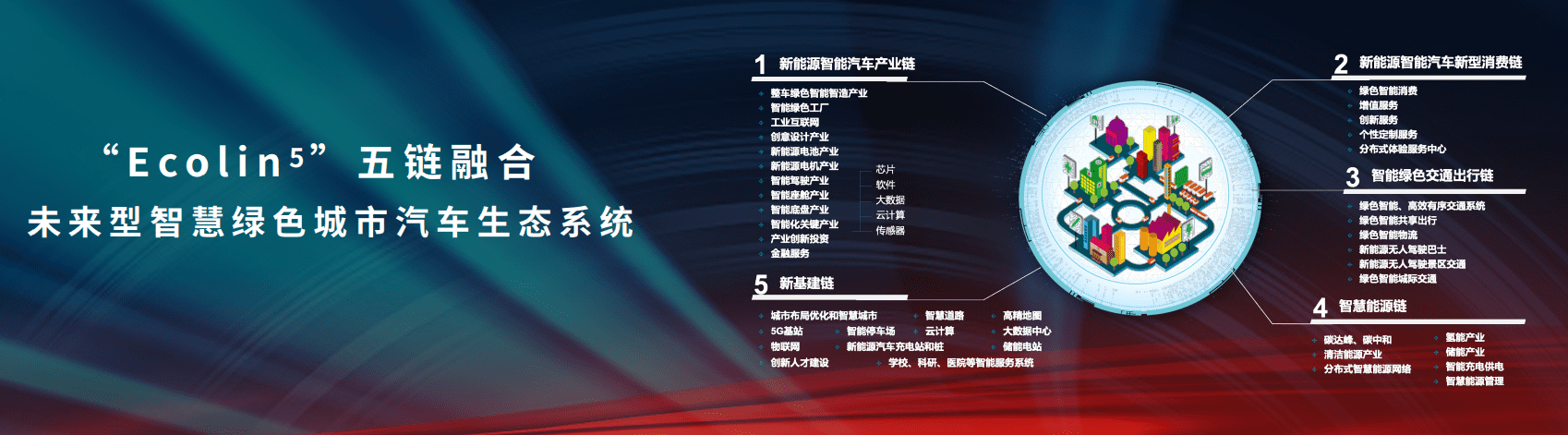 在今年4月的上海国际汽车展上,中国一汽徐留平董事长发布了EcoLin5“五链融合”汽车产业发展新模式,全力打造以新能源智能汽车产业链为核心链,融合新型消费链、智能绿色出行链、智慧能源链、新基建链等“五链”为一体的未来型智慧绿色城市汽车生态系统。
