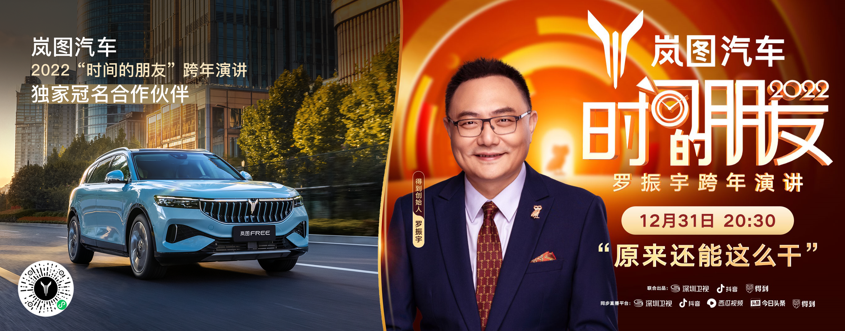 2021年12月31日,罗振宇2022“时间的朋友”跨年演讲将在成都金融城演艺中心开讲,今年主题为“原来,还能这么干”,罗振宇将把一年来他与团队所观察到的社会创新、企业创新与最佳实践,分享给观众。岚图汽车作为独家冠名合作伙伴,将携手“时间的朋友”与中国新中坚一起迎接2022。为感谢过去一年用户们对岚图汽车的支持,岚图汽车还准备了特别的跨年惊喜。12月8日起,岚图用户可通过岚图汽车APP和岚图空间、岚图展厅参与话题互动,将有机会亲临跨年现场,与罗振宇共同总结2021迎接2022。
