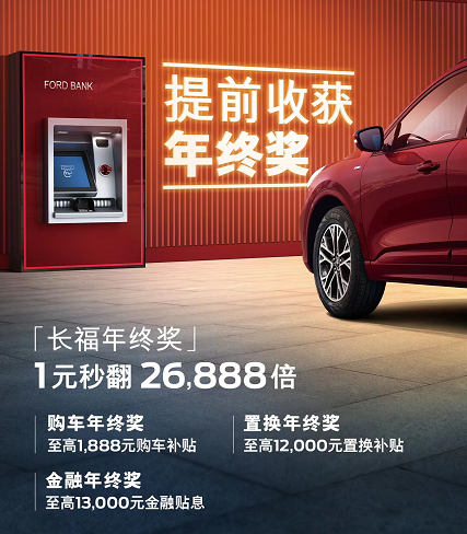 第二份大礼是“1元秒翻26888倍”的“长福年终奖”。只要在福特商城1元下订指定的活动车型,至高可享受26,888元的购车权益,提前收获年终奖。