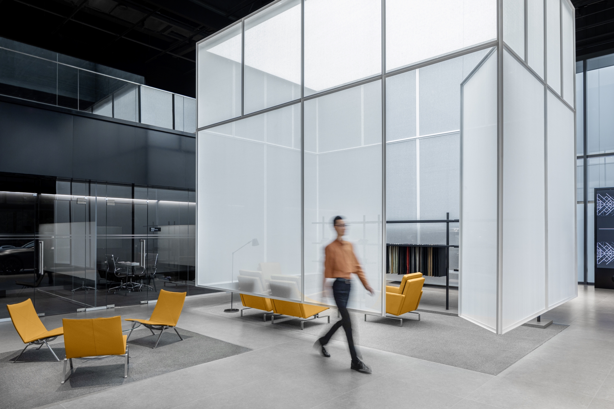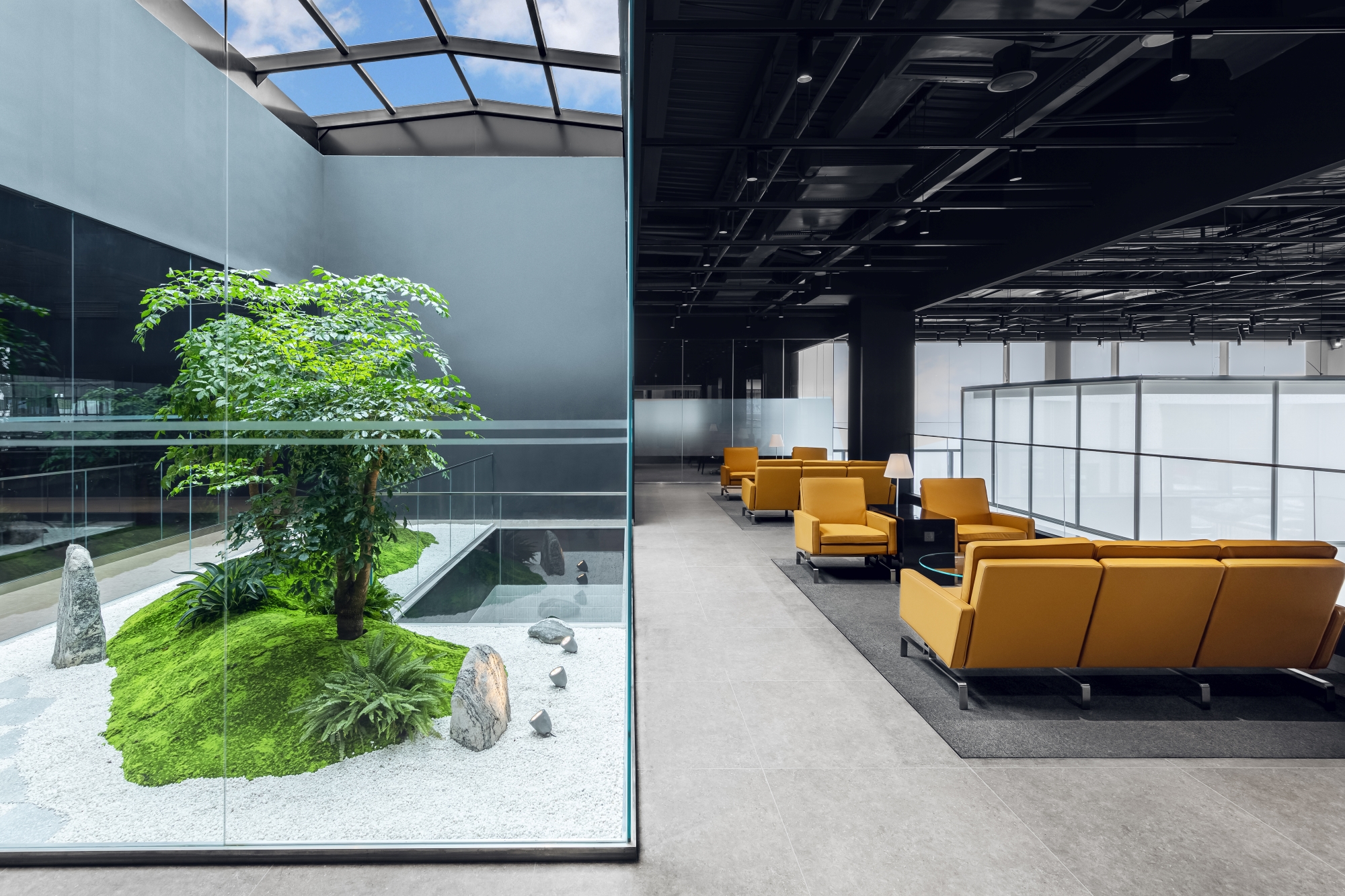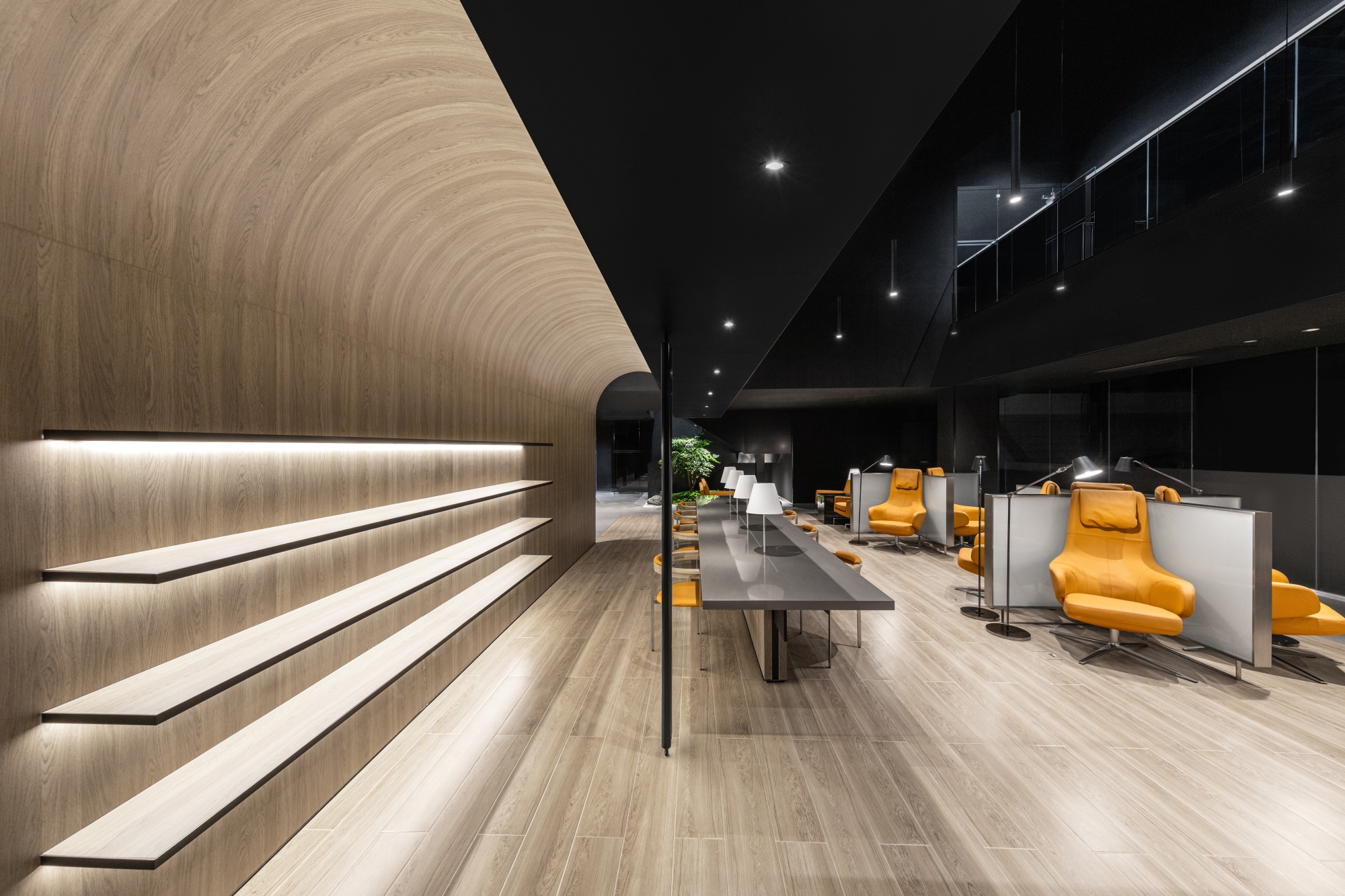 思廊(The Genesis Lounge)在橡木与铜饰面的相互辉映下,让消费者和车主在温馨而舒适的氛围中享受真挚周全的服务;在开放式的展厅内,则由织物隔板划分出车辆定制服务的专属区域。在展厅中庭,生机盎然的绿植与倾泻而下的阳光相映成趣,为极简主义的空间增添了一份暖意和自然美韵。