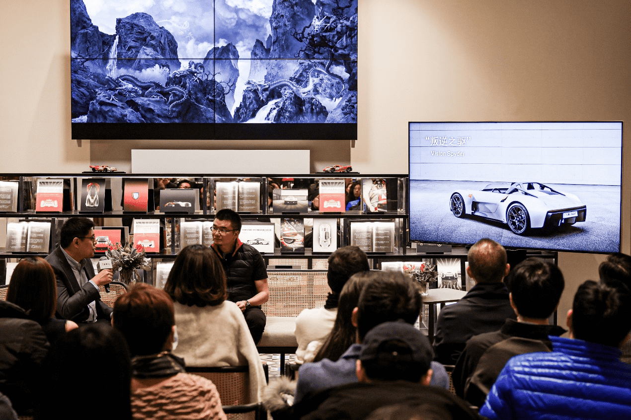 “见,所未见”,保时捷在不断寻找自己未来方向的同时,也在积极吸收多元化的角度和思考。新书品鉴会的最后环节,保时捷联合现代传播集团将“保时捷艺术客厅”带到现场,通过著名建筑师/工业设计师吕永中先生、著名艺术家/空间设计师吴滨先生,以及郭城先生和王一先生的视角,从场景、性格、灵感和未来美学探索等角度出发,解读“今天的我们如何去塑造未来世界的方式”。