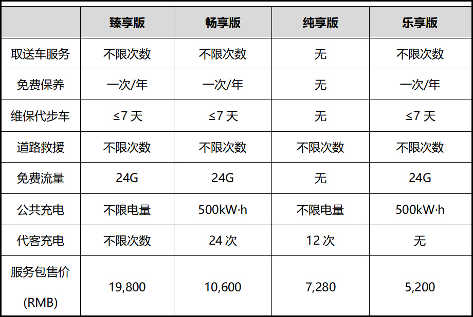 针对国内新能源车主的典型用车、充电需求,领界EV对7大服务内容进行排列组合,并最终提供4个版本的服务包类型:针对日常用车频繁且行程较满的用户推出臻享版;针对家中已有充电桩,但用车频繁的用户提供畅享版;针对只需公共充电的用户提供纯享版;针对零星公共充电需求的客户提供乐享版。