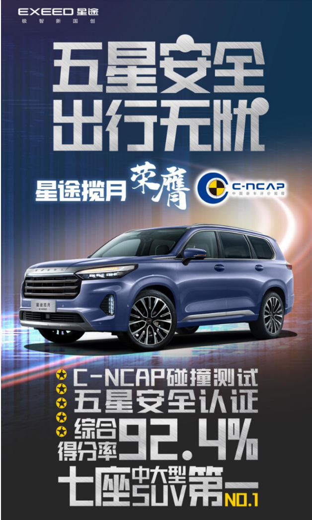 星途汽车在安全研发方面的重视及强大技术储备,让揽月获得多项佳绩。2021年11月18日,中国汽车技术研究中心公布2021年度测评车型星途揽月C-NCAP的评价结果。星途揽月荣获“五星”安全评级,并以92.4%的综合得分率,获得自2018版新规以来,7座中大型SUV新车安全评测中第一名。揽月在主被动安全领域的过硬素质,展现出中国自主高端品牌在安全领域的科研能力与实力。