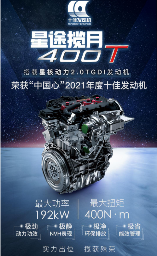 另外,在与众多合资及中国头部自主品牌车企角逐中,星途揽月400T的星核动力2.0TGDI发动机过关斩将,获选“2021年中国心十佳发动机”,更是对星途汽车在发动机研发领域技术实力的认可。