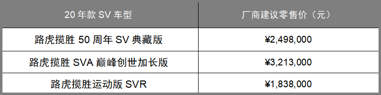 除20年款路虎揽胜50周年SV典藏版和20年款路虎揽胜运动版SVR之外,20年款路虎揽胜巅峰创世加长版也一同在活动现场公布售价: