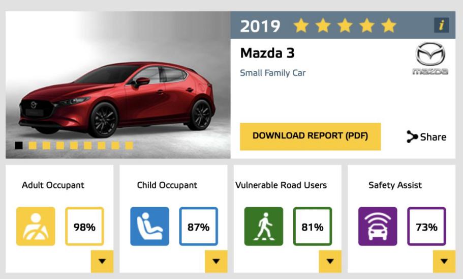 成人保护评价包括碰撞试验、侧面碰撞试验、侧面撞柱试验以及鞭打试验四类,满分38分,次世代Mazda3昂克赛拉得分为37.5分,达到98%的好成绩,成为继沃尔沃V40、沃尔沃XC60和阿尔法·罗密欧Giulia之后第四款拿到该成绩的车型。
