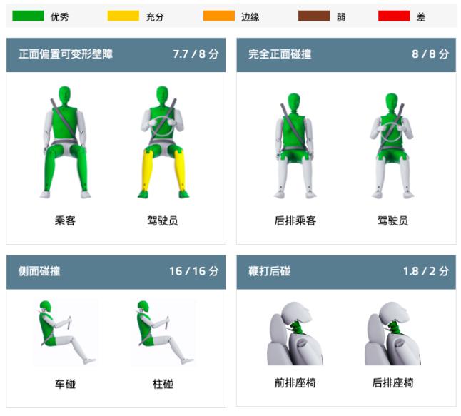 安全辅助系统由安全带提醒装置、限速装置以及ESC装置的配置情况计算得出。次世代Mazda3昂克赛拉前后排安全带未系提醒功能、电子车速限制、车道偏离预警系统与自动刹车系统均获得优秀评价,展现出先进的主动安全防护性能。