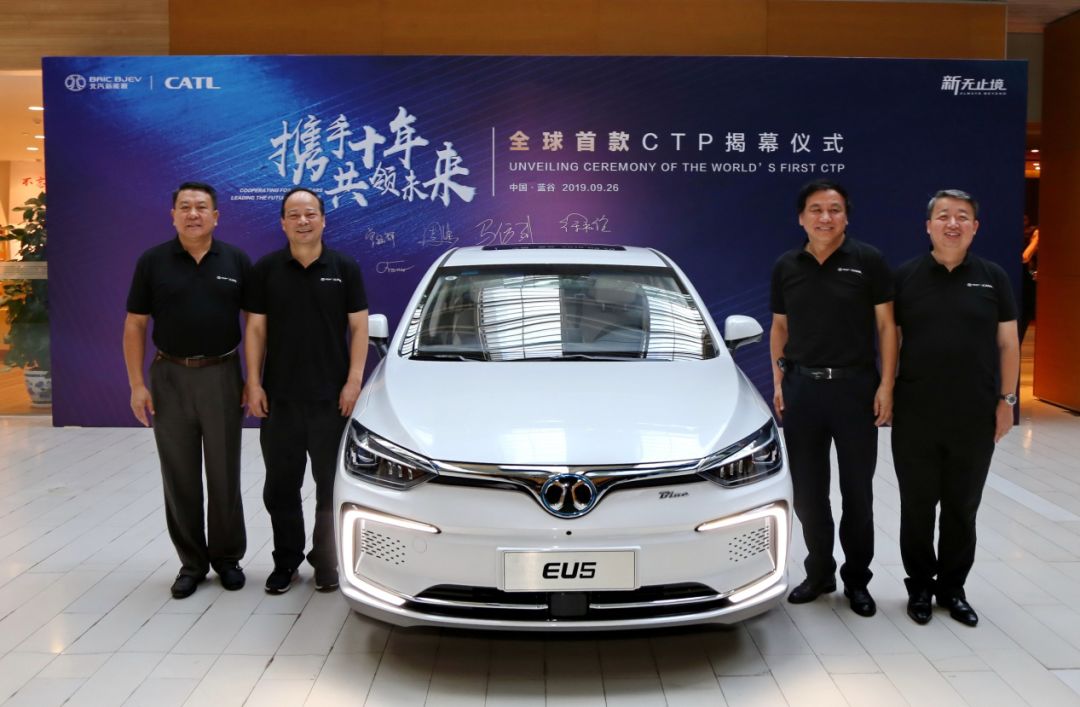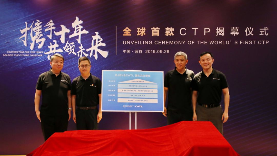 【中国汽车趋势网讯】2019年9月26日下午,由北汽新能源与宁德时代携手打造的全球首款CTP电池包(Cell to Pack,无模组动力电池包)在北汽新能源总部——中国蓝谷正式发布,双方再度携手引领行业方向。北汽集团、北汽新能源党委书记、董事长徐和谊和宁德时代董事长曾毓群共同为首款CTP电池包揭幕,北汽新能源党委副书记、总经理马仿列,宁德时代总裁周佳等双方高层出席了揭幕仪式。据悉,全球首款CTP电池包将搭载在北汽新能源EU5车型上。