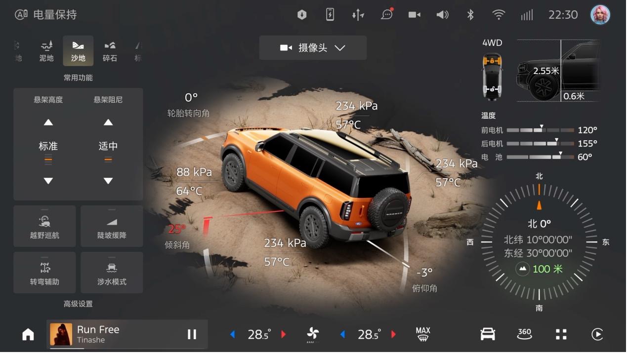 自动越野的加入,让复杂路况的操控更趋稳定。该模式支持低至2km/h的缓行控速,最高可达30km/h,驾驶者无需控制油门刹车,只需专注方向即可平稳通过坑路。配合"越野360"系统实时显示的车身倾角、坡度、轮胎负载等30余项关键参数,让驾驶者对车辆状态了如指掌,进一步提升操控信心。