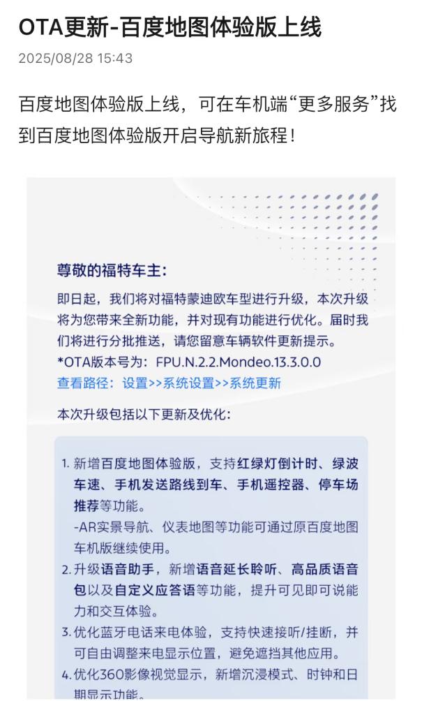 【中国汽车趋势网 12月11日讯】在智能化浪潮下,汽车早已成为集娱乐、导航、通信于一体的“第三生活空间”。但与智能手机的快速迭代不同,车载信息娱乐系统的 “老龄化” 成为行业普遍痛点:老车主要么忍受落后功能,要么冒险改装面临安全隐患。而负责任的车企,正通过持续OTA升级打破这一困境 —— 福特蒙迪欧自今年8月起推进的车机优化,便是最佳例证。