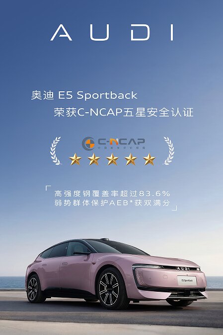 【中国汽车趋势网 3月27日讯】近日,中汽中心汽车测评管理中心正式发布2026年度最新一批《中国新车评价规程(C-NCAP)》车型测评结果。奥迪E5 Sportback凭借全面领先的整车安全架构与极致全域防护性能,以91.3%的综合得分率,荣获C-NCAP最高等级五星安全认证,充分彰显了其在豪华纯电市场标杆级的安全硬实力,更印证了奥迪的百年造车底蕴。