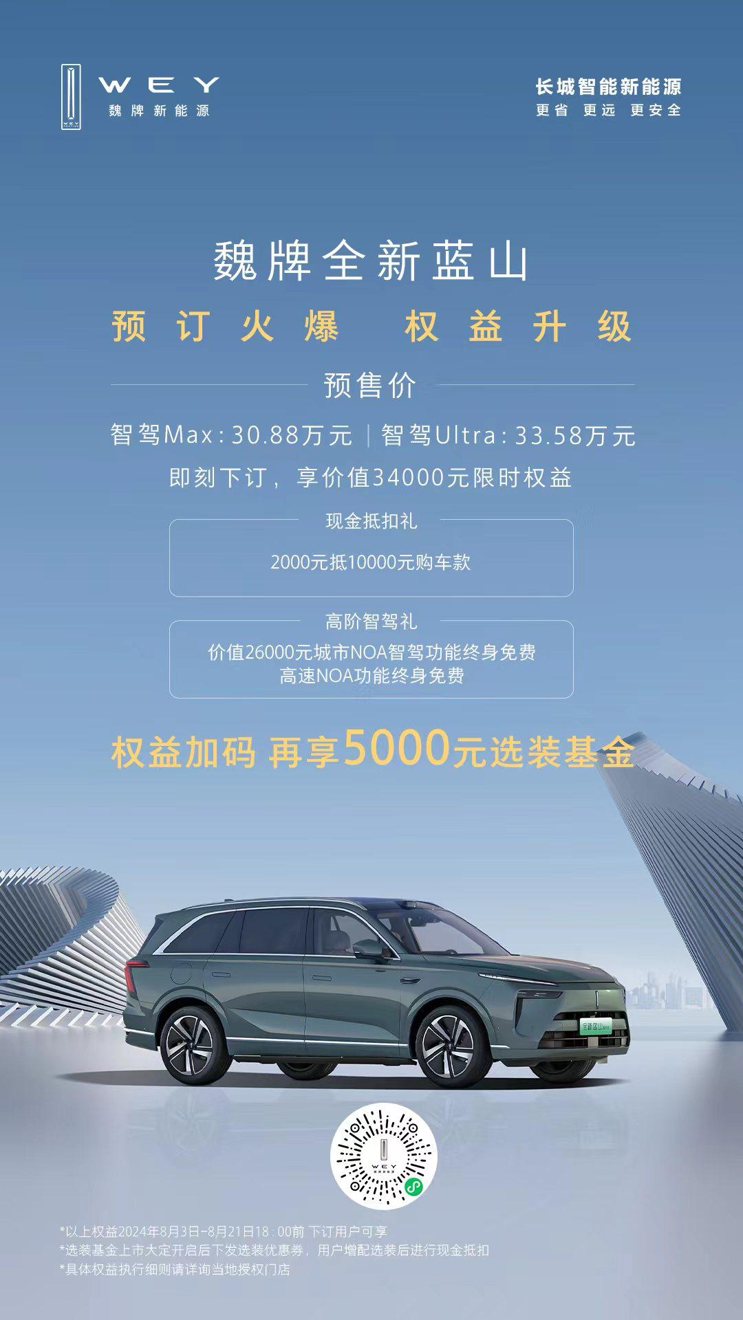 截止8月21日18:00前,用户可在魏牌新能源官方APP、小程序等渠道下订。下订用户可享预订权益包括,现金抵扣礼(2000元抵10000元购车款),高阶智驾礼(价值26000元城市NOA智驾功能终身免费,高速NOA功能终身免费),现在权益加码,可再享5000元选装基金。更多详细的售价及购车政策,将在上市发布会现场揭晓,更多惊喜敬请持续关注。