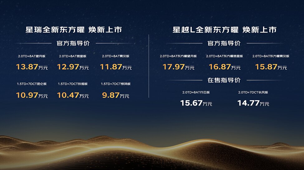 【中国汽车趋势网讯】2025年9月23日,吉利中国星全新东方曜系列正式上市,实力派演员欧豪作为吉利中国星官方代言人,亲临现场,不仅首次公开演唱新歌《雨点》,还与总台主持人马凡舒温馨互动,全场齐唱《我和我的祖国》,为祖国献上深情的祝福,将现场气氛推向高潮。中国星全新东方曜以“中国设计、智能科技、极致驾控、越享舒适、中国式安全” 重新定义中国燃油车的价值标准,官方指导价9.87万至17.97万元。其中,星瑞全新东方曜焕新2.0TD+8AT与1.5TD+7DCT两种动力组合共六个版本,官方指导价官方指导价9.87万至13.87万元;星越L全新东方曜则焕新三款2.0TD+8AT车型,官方指导价15.87万至17.97万元。