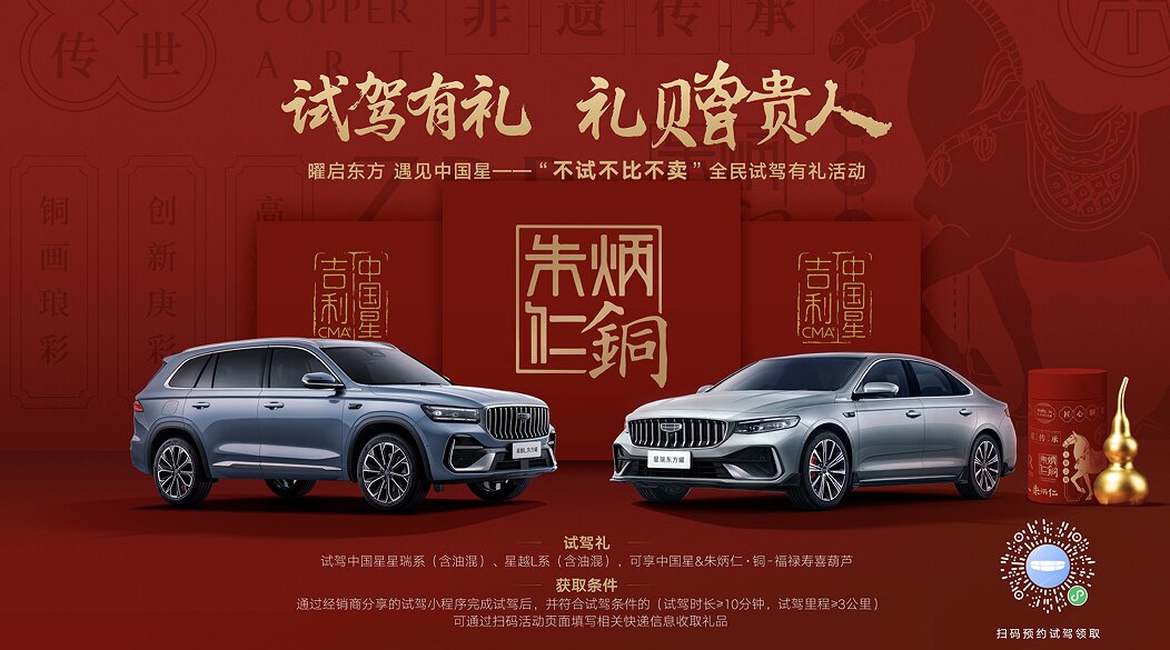 即日起至12月31日,针对购买中国星星瑞全系、星越L全系用户,每月将在第三方检测机构的监督与公证下,抽取300名幸运用户免费赠送中国星东方曜限量定制款MEIZU 22手机。此外,吉利中国星还携手中国非遗铜雕文创品牌——朱炳仁·铜,发起“试驾有礼,礼赠贵人” 不试不比不卖全民试驾有礼活动,到店试驾中国星星瑞、星越L系列车型,即可获赠由“朱炳仁·铜”匠心打造的【福禄寿喜葫芦挂件】一份。