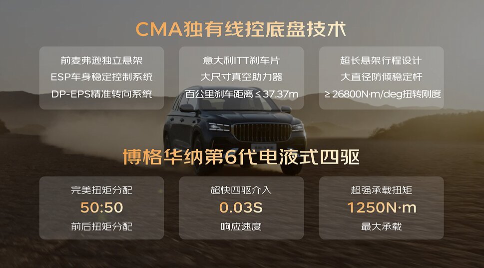 驾控性能上,全新东方曜系列搭载2.0TD高功率大涡轮发动机+爱信8AT黄金动力总成,最大功率200kW,峰值扭矩400N·m,零百加速仅6.5秒,性能提升14%,让高性能,不再只是豪华品牌的专属;基于CMA线控底盘打造,并配备四轮独立悬架、运动负外倾角设计及大直径防倾稳定杆等,使得全新东方曜系列在极致运动与舒适驾乘之间找到完美平衡。更值得一提的是,星越L全新东方曜还将搭载博格华纳第六代电液式四驱系统,0.03秒极速响应,实现50:50扭矩分配,无惧湿滑雨雪,亦可纵情旷野。