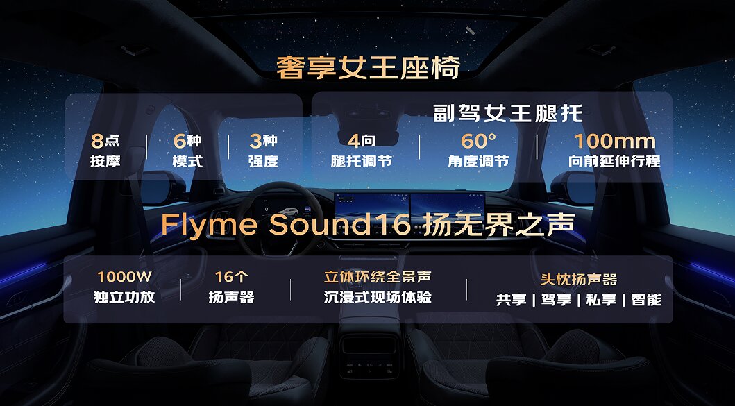 越享舒适上,星越L全新东方曜不仅主驾配备座椅按摩功能,还配备了焕新升级的“奢享女王副驾”,拥有8点座椅按摩,6种模式,3种强度,以及新增4项腿托功能,只需轻触调节,腿托即可向前延伸达100毫米,并支持高达60度的多角度自由调节。轻松实现零重力坐姿。后排靠背支持30°-40°电动无级调节,一键到位,每位乘客皆可从容安坐。而在听觉上,全新东方曜系列搭载由大师级团队专业调校的Flyme Sound 16扬无界之声,12通道精准布局,含同级唯一主驾头枕私密声场,真正实现“移动音乐厅”般的沉浸体验。而豪华麂皮内饰、琉璃溢彩256色氛围灯、高级车载香氛、50W无线快充等细节功能的加入,则让全新东方曜系列更具人性光辉。此外,星越L全新东方曜系列通过AI数字底盘与CCD可变阻尼悬架深度融合,实现了毫秒级动态响应,让底盘学会“思考”,提前预判、主动适应,于颠簸中提炼从容,赋予全家出行的松弛感。