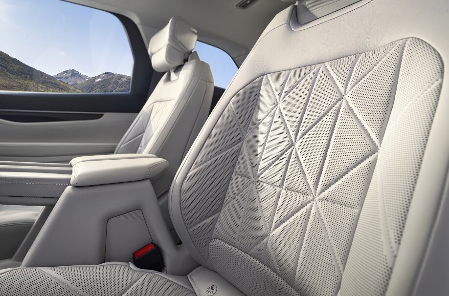 该皮料运用极薄的涂层技术(仅为Nappa真皮涂层厚度的50%),几乎不遮盖牛皮天然纹理与毛孔,最大限度保留牛皮原始柔软度和肌肤般触感,且每平方英尺约含百万微孔,透气性极佳,长时间乘坐也不易闷热(比Nappa提升约30%)。最后再辅以定制化打孔及绗缝工艺,显著提升了座椅的豪华感和透气度。得益于天然