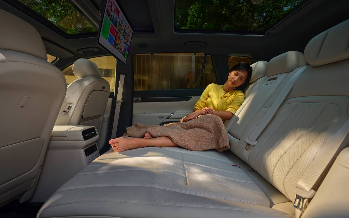 2026款eπ008五座版拥有“超5米车长、超3米轴距”的越级尺寸,直接赋予了后排同级最大的腿部空间,为乘坐舒适奠定坚实基础。值得一提的是,得益于同级唯一的二排电动魔毯座椅设计,2026款eπ008五座版的后排拥有颠覆性的使用体验。后排腿托展开可形成1.5米的横向单人床,宽大的后排空间可供小朋友休息或玩耍;将主副驾头枕拆掉后放平,则可与后排座椅形成同级最长、超2米的L型双边贵妃榻,成为绝佳的午休小憩场所;放倒后排座椅以后,更可一键成床,形成同级唯一的2.4米超大双人床,带来堪比房车的舒享体验。