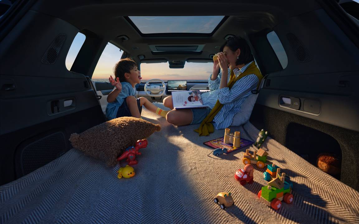 除了百变的后排体验以外,2026款eπ008五座版还依托车内豪华配置和极致空间,拓展出丰富的使用场景。超5米的车身尺寸,为新车带来了同级领先的22处储物空间,以及超1.8立方米的超大容积后备厢,可轻松收纳露营、钓鱼、骑行等全套装备,配合车内双全景天幕及遮阳帘、冷暖两用智能冰箱、220V车内电源接口,摇身即变户外露营房。此外,2026款eπ008五座版的后排还标配15.6英寸智能娱乐屏,配合全车18个扬声器的WANOS全景声音乐座舱,以及由双层夹胶隔音玻璃、21英寸品牌静音轮胎打造的静谧空间。出门在外,eπ008五座版就是绝佳的家庭影音娱乐房。