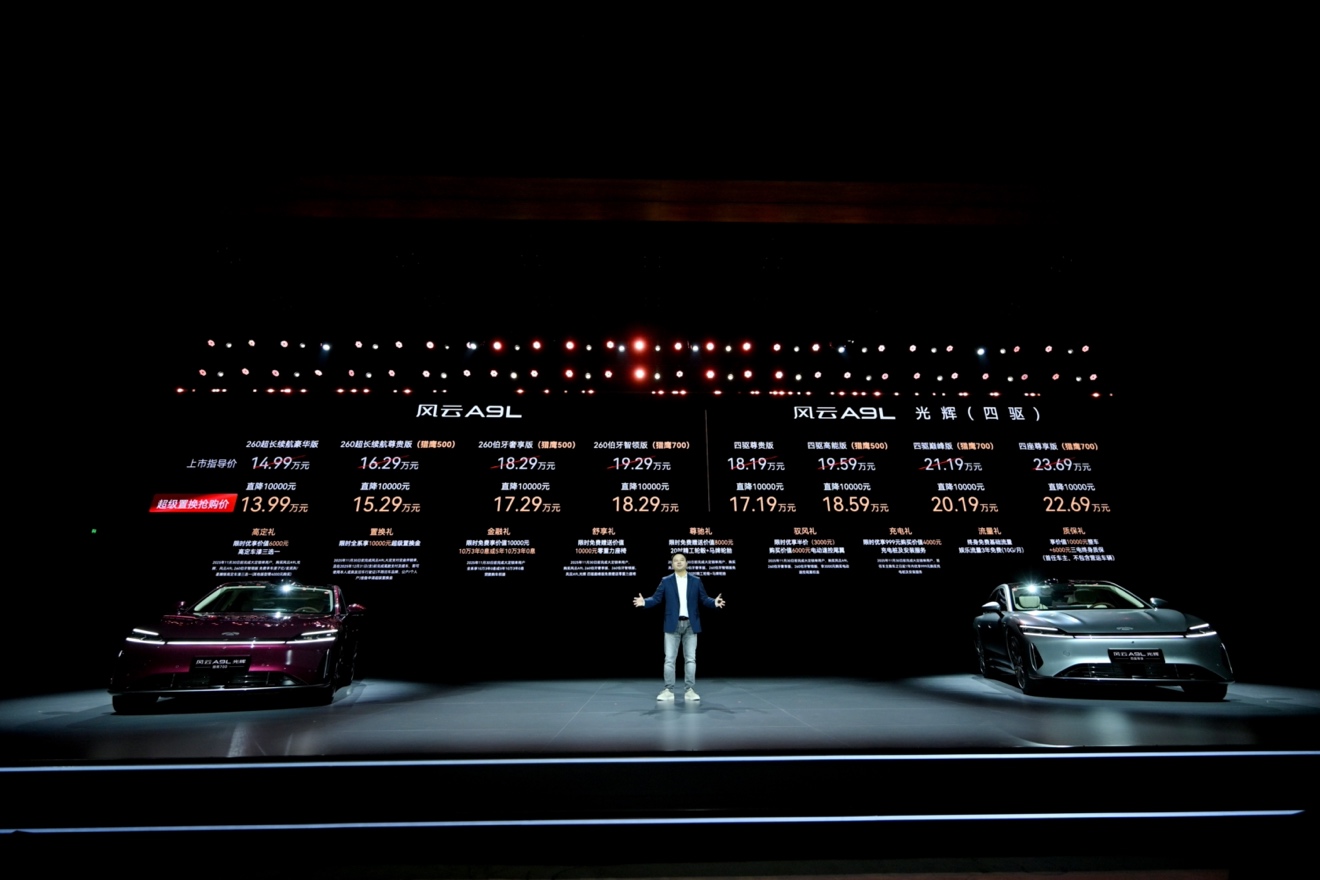 【中国汽车趋势网讯】2025年11月15日,"进化"风云A9L光辉(四驱)全球上市发布会在重庆广阳岛国际会议中心隆重举行,本次上市共推出四款版型,正式售价为17.19万元起,共推出四个版本车型,其中四驱尊贵版售价17.19万、四驱高能版(猎鹰500)售价18.59万、四驱巅峰版(猎鹰700)售价20.19万、 四驱尊享版(猎鹰700)售价22.69万。并同步推出"九大购车权益",涵盖高定、置换、金融、舒享、尊驰、驭风、充电、流量、质保多重礼遇,为中国豪华汽车市场再次立下全新标杆。