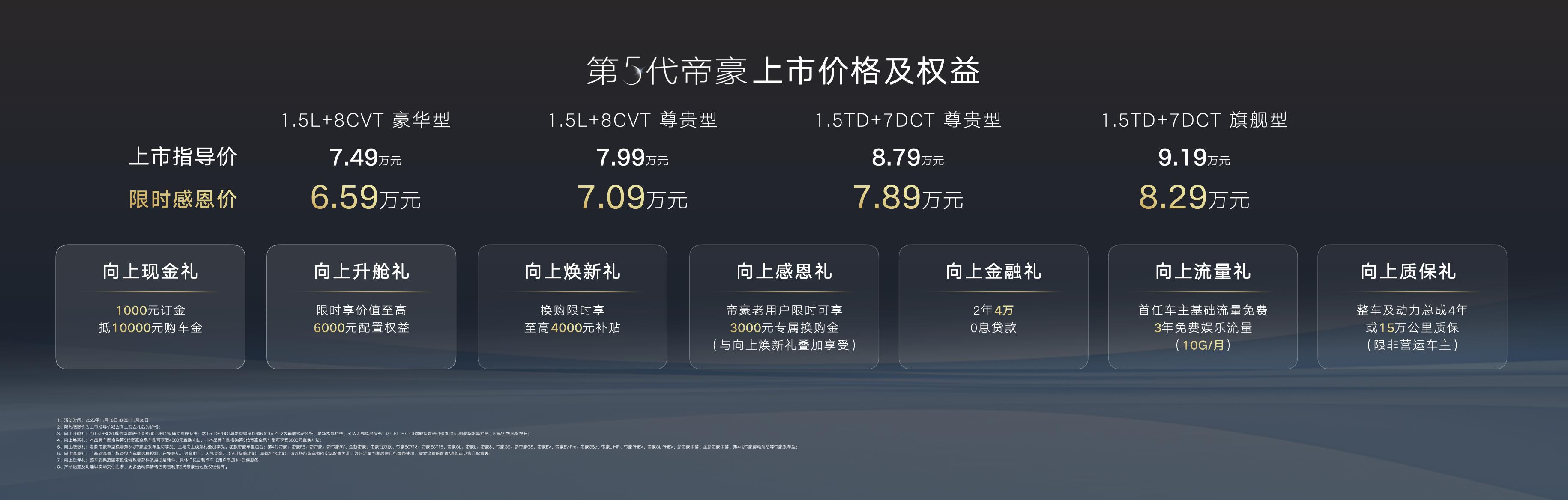 感恩400万,荣耀新篇章。第5代帝豪即日起推出7重上市礼遇,2025年11月30日前购车用户,可享包含1000元订金抵10000元购车金的向上现金礼;限时享价值至高6000元配置权益的向上升舱礼;换购限时享至高4000元补贴的向上焕新礼;帝豪老用户可享3000元专属换购金的向上感恩礼(与向上焕新礼叠加享受);2年4万0息贷款的向上金融礼;首任车主基础流量免费,3年免费娱乐流量(10G/月)的向上流量礼;整车及动力总成4年或15万公里质保(限非营运车主)的向上质保礼。除此之外,作为帝豪持续越级向上,给用户带来超越期待体验精神的延续,用户还可选装千里浩瀚辅助驾驶H3方案。第5代帝豪首次将包含行车、泊车、安全三大维度的高阶辅助驾驶系统带入8万级燃油车型,拥有最高支持120km/h刹停的AEB急刹避险功能和同级唯一AES主动紧急避让功能,为用户提供“沃尔沃”式安全感,真正做到“科技平权、油电同智”。