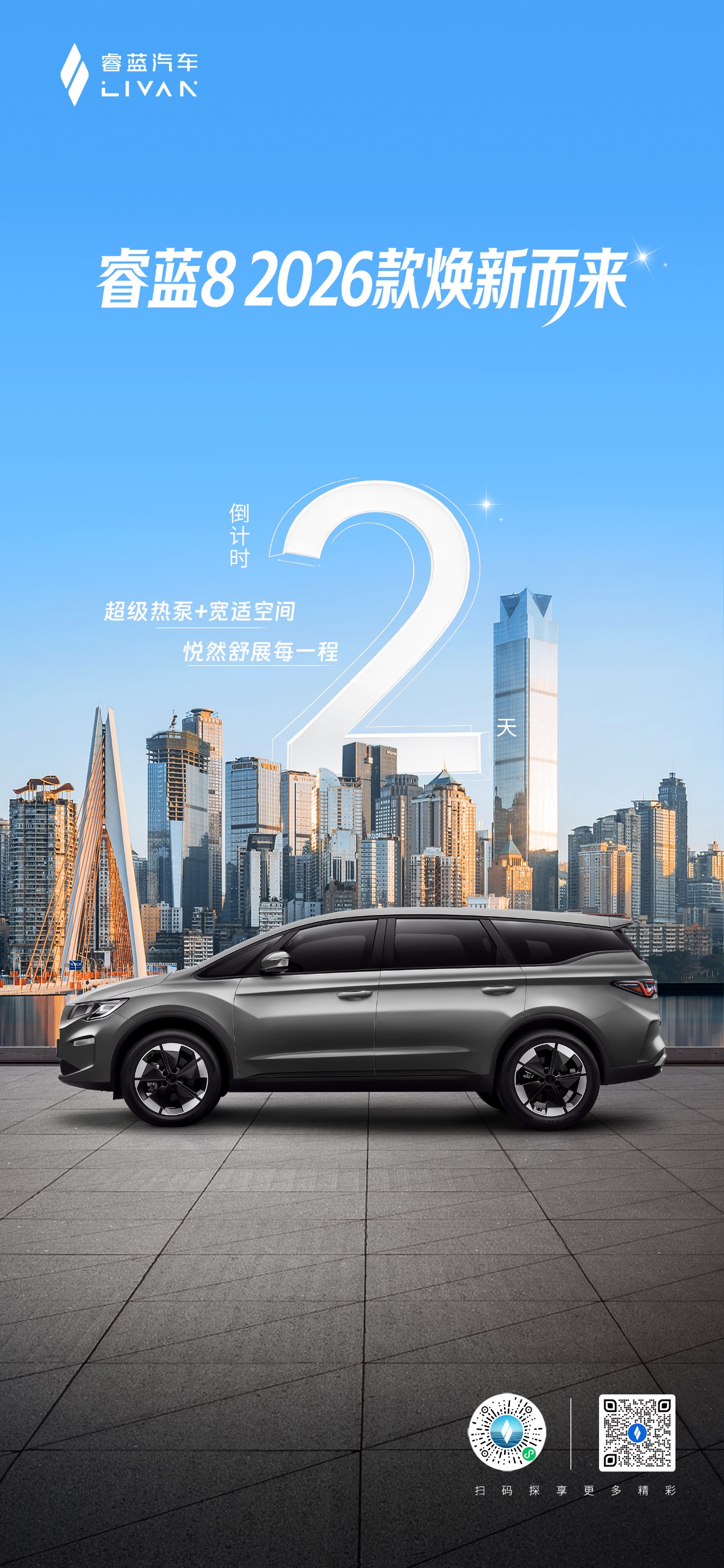 拒绝妥协,全能焕新!睿蓝8·2026款以用户需求为核心,在空间、续航、动力、舒适等多维度实现突破升级,将重新定义10万级纯电MPV的价值标杆。目前,新车上市进入倒计时阶段,更多重磅焕新细节、权益等核心信息将陆续释放,1月16日锁定官方渠道,第一时间获取最新动态,与睿蓝8·2026款共赴品质纯电出行新旅程!