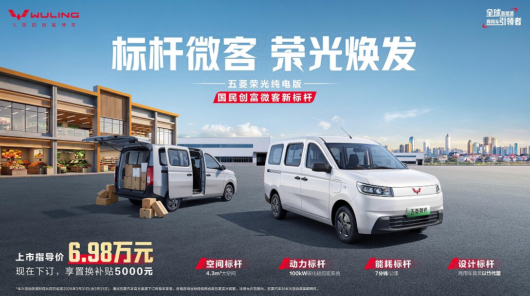 【中国汽车趋势网讯】“标杆微客,荣光焕发”。2026年3月9日,五菱荣光纯电版正式上市,推出310km标准型,售价6.98万元。作为“国民创富微客新标杆”,新车拥有4.3m³大空间,还搭载行业领先的100kW高效碳化硅后驱系统、国际领先的“以竹代塑”环保内饰等创新技术,实现“空间、动力、能耗、设计”四大维度的全面标杆进化,引领以燃油为主的微客市场进入新能源时代。即日起,全国用户通过五菱汽车官方渠道下订五菱荣光纯电版,即可享受5000元的置换补贴,助力奋斗者创富再加码,让新能源发展红利惠及更多以微客为主要创富工具的小微创业者。