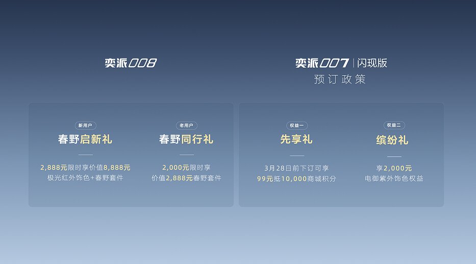 奕派008“极光红”全新车色由东风奕派与用户共创,并携手中国国家地理将阿勒泰红色极光复刻于车身,车漆质感通透且抗刮耐磨。以车顶横杆行李架+固定侧踏板+放电插排为组合的“春野套件”,全场景适配城市露营与户外穿越,解锁更自由的探索生活。为回馈新老用户支持,推出限时购车权益,新用户下订极光红外饰色绑定春野套件限时先享价2888元;老用户可在APP下订春野套件,限时回馈价2000元。此外,奕派008即将全系推送OTA 升级,在娱乐影音、行车安全、车机智能交互等方面,全面优化用车体验,为用户带来更安全、更好玩的用车体验。