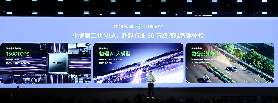 为满足不同用户的智驾需求,新车提供Max版和Ultra SE版双算力版本可选,兼顾高阶性能与实用体验,覆盖全场景出行。其中,Ultra SE版配备双图灵AI芯片,有效算力高达1500TOPS,搭载小鹏第二代VLA,这是一套面向L4时代的物理世界模型,不仅安心丝滑,全场景都能开,而且像老司机一样高效。而Max版搭载单颗图灵AI芯片,有效算力达750TOPS,目前搭载小鹏第一代VLA,2026年第三季度将开启小鹏第二代VLA蒸馏版上车,在驾驶体验、运行帧率、响应时延与稳定性等维度,完整保留小鹏第二代VLA的核心能力。
