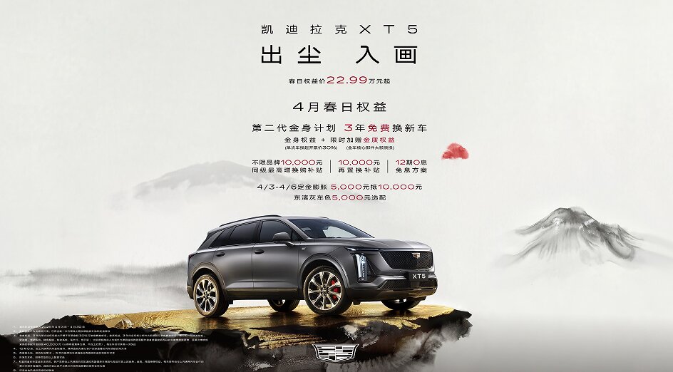 此次活动中,凯迪拉克XT5带来多重春日焕新权益:全新车色「东漓灰」正式亮相,限时选配价5000元,超跑质感触手可及;重磅升级第二代“金身计划”,在已有车损超三成免费换新的基础上限时加赠“金质权益”,三年内全车核心部件大额质损同样享受免费换新车,品质安全双重兜底。与此同时,凯迪拉克XT5推出多项春日限时福利,包括不限品牌10,000元同级最高增换购补贴、12期0息金融方案、5年内10,000元再置换补贴,叠加限时5,000元抵10,000元定金膨胀,春日限时权益价22.99万元起。