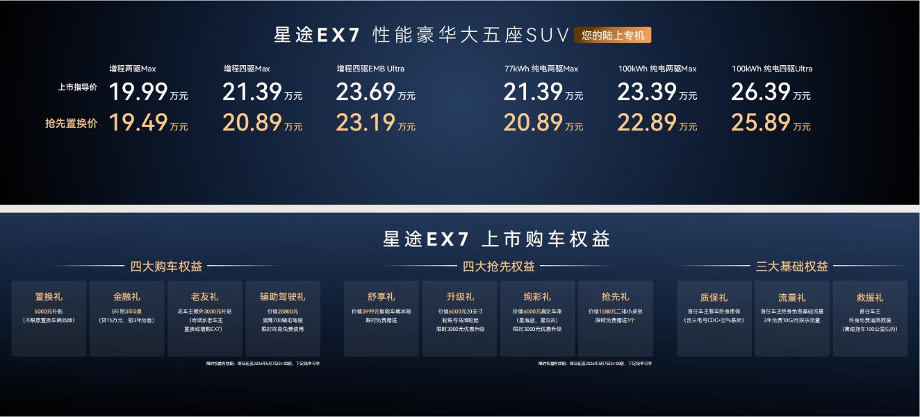 星途EX7提供纯电与增程双动力选择,共推出增程两驱Max、增程四驱Max、增程四驱EMB Ultra以及77kWh纯电两驱Max、100kWh纯电两驱Max、100kWh纯电四驱Ultra六款车型,官方指导价为19.99万元—26.39万元,抢先置换价为19.49万元—25.89万元。与此同时,星途汽车官方还为用户提供了多重购车福利:包括置换礼、金融礼、老友礼、辅助驾驶礼四大购车权益;舒享礼、升级礼、绚彩礼、抢先礼四大抢先礼;此外,首任车主还可享受整车终身质保、终身免费基础流量、终身免费救援礼三大基础权益,让每位用户轻松拥有豪华奢享出行新体验。