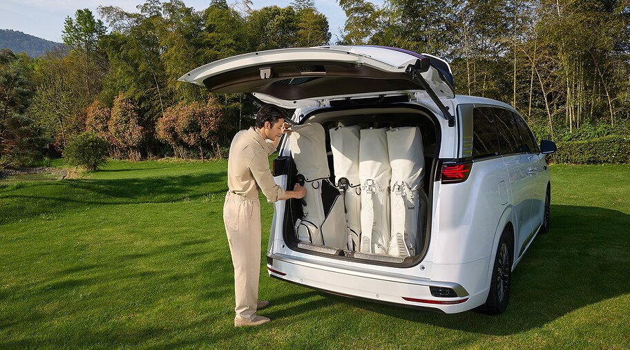 同时后备厢新增126L下沉式储物空间,能放下1整个高尔夫球包;后备厢整体容积达882L,是混动豪华MPV中最大的后备厢。即便7人舒适满座,也可以并排放下4个高尔夫球包或12个行李箱。全家集体出行、商务差旅收纳需求一站式满足,彻底告别满员出行行李放不下的尴尬。
