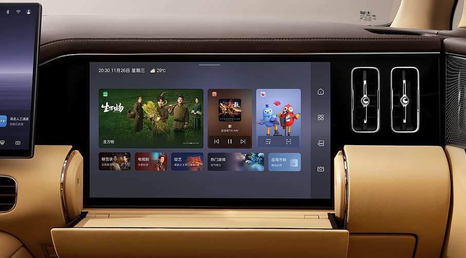 全球首创副驾开合智能屏,开合自如的智能设计,精准适配多元出行场景,可收可放,大小随心。听歌时,用精致小屏;沉浸式观影,一键翻转,秒变专属大屏;折叠台面还可充当置物区,可以随手放墨镜、耳机、口红,兼顾简约美学与实用需求。